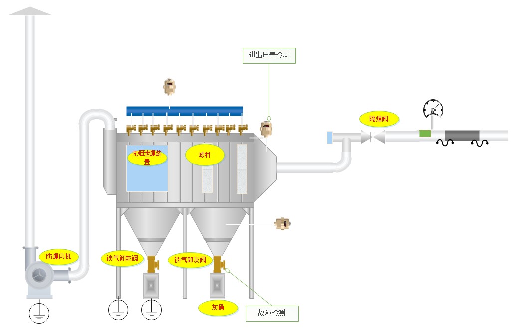 粉體防爆泄壓產(chǎn)品主要有泄爆片、無(wú)焰泄爆裝置、隔爆閥、火花探測(cè)及熄滅裝置等。另外風(fēng)壓差檢測(cè)報(bào)警裝置也是對(duì)除塵器的性能進(jìn)行有效預(yù)防的一個(gè)重要手段。
