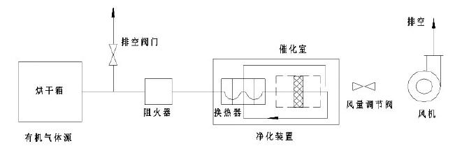 該裝置主體結構由凈化裝置主機、引風機、控制系統三大部分組成。其中凈化裝置包括:除塵阻火器、熱交換器、預熱器、催化燃燒室。