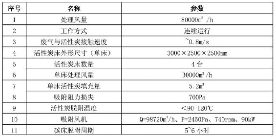 廢氣成分主要為苯系物(苯、二甲苯、甲苯等),活性炭床單床處理風量為 30000m3/h,按照連續運行方式設計則活性炭床數量為 4 臺,工作時始終有一臺活性炭床處于備用狀態。活性炭床設計空塔氣速 0.8m/s,駐留時間為 0.625s,按初始濃度 200mg/m3計算則單床吸附周期為 93.7h。