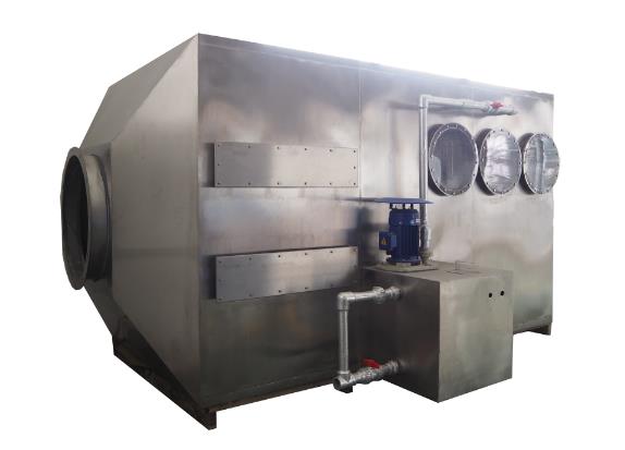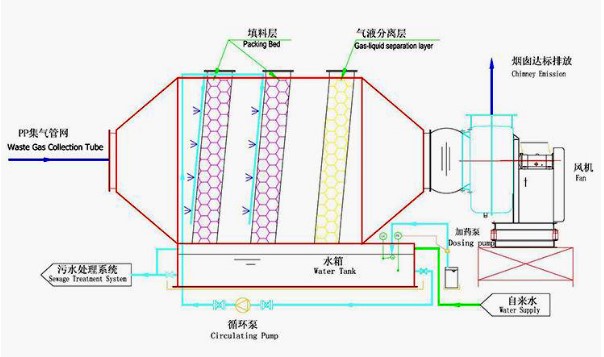 廢氣從塔底進(jìn)入塔內(nèi),氣體從底部通過填料層,然后從塔頂?shù)某隹谂懦觥K畯乃捻敳亢椭虚g均勻地通過液體分配器噴射到填料層,并沿著填料層的表面流下,直到塔的底部由泵送到塔的頂部和中間以便回收。水汽和剩余的廢氣進(jìn)入脫水除霧階段,脫去液滴、霧氣。經(jīng)過初始處理后的氣體從吸收塔的上端排氣管進(jìn)入下一級(jí)處理階段或排出大氣。
