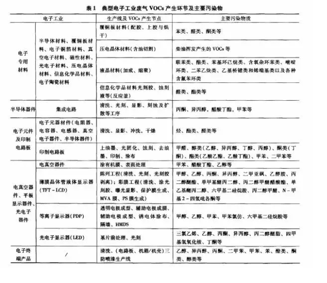 電子行業中的VOCs種類常見的就達30多種,主要來自半導體器件、電子元器件、電子組件、平板顯示器、整機機殼的表面涂層工藝使用溶劑型涂料、清洗工藝(包括芯征清洗、玻璃基板清洗、電路板清洗、電子組件清洗等)使用有機脫脂劑、脫水劑,感光成像工藝中的光刻膠稀釋劑、顯影劑、脫膠劑、液態阻焊膜劑、去膜劑等使用有機溶劑,去光刻膠類化合物如DMSO、MEA、NMP、DMAC、DGA則屬于高沸點的硫類和胺類之有機溶劑。